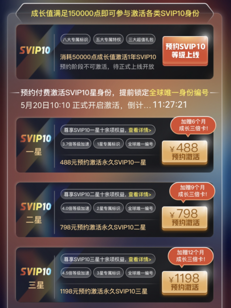 798 元预约激活永久 SVIP10 二星,4.0 倍等级加速,加赠 9 个月成长三倍卡。