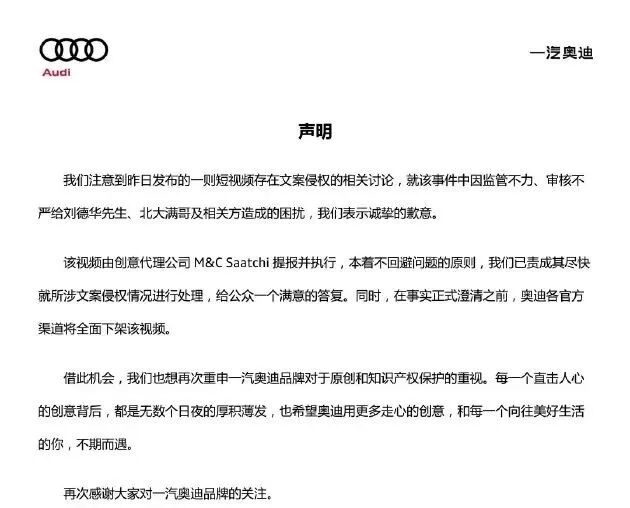 奥迪回应小满广告抄袭