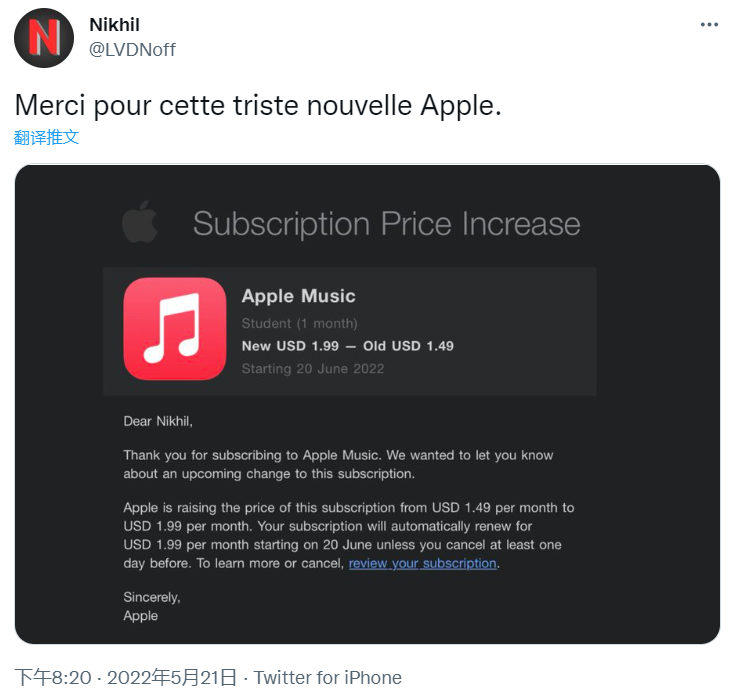 苹果给南非学生订阅用户的一封电子邮件中写道:“感谢您订阅 Apple Music。我们想让您知道此订阅即将发生的变化,这项订阅的价格将从每月 1.49 美元提高到每月 1.99 美元。”