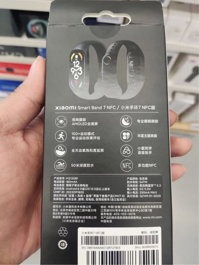 小米手环 7 将于 5 月 24 日 19:00 举行的 Redmi 新品发布会亮相,包括标准版和 NFC 版两个版本。现在小米手环 7 NFC 版的外包装盒已经曝光。