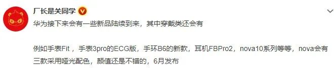 此外,华为将会在 6 月初发布新款华为 Watch Fit 2 智能手表,华为 Watch 3 Pro 的 ECG 版,华为手环 B6 的新版本,华为耳机 Freebuds Pro 2,华为鸿蒙手机 nova10 系列等等。(来源:IT之家)