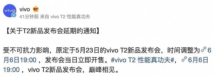 vivo官方微博22日发布通知称,受不可抗力影响,原定于5月23日的vivo T2新品发布会,时间调整为6月6日19:00 ,发布会当日立即开售。(来源:新浪科技)