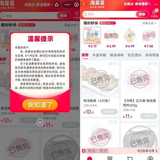 11 月 16 日,阿里巴巴旗下淘菜菜还发布通报称微信小程序运营的产品遇到一些互联互通的壁垒(升级版今年 3 月提交审核申请,但至今未审核通过),为了给消费者带来更好的体验,避免因互联互通壁垒带来的服务障碍,暂停贵州仓服务。