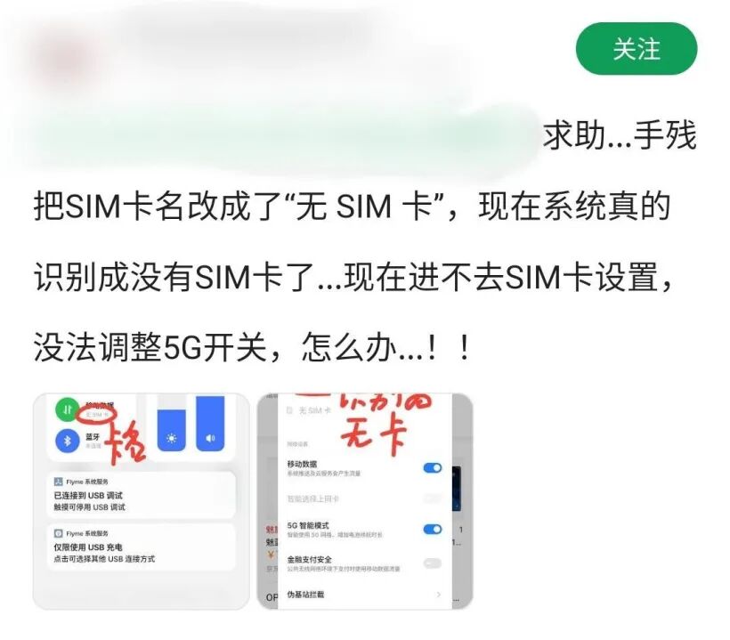 某平台网友发帖称自己一时突发奇想把自己 SIM 卡的卡名改成了「无 SIM 卡」,结果 Flyme 9 竟然真的给识别成了无 SIM 卡状态而且相关选项变成了灰色(可正常上网),所以该网友就是想修改回去也无法进入 SIM 卡设置功能,更没有办法调整 5G 开关,因此向大家求助。