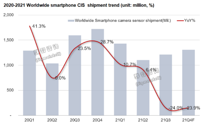 根据群智咨询调查报告显示,2021 年第三季度全球智能手机图像传感器出货量约为 12.1 亿颗,同比下降约 24.0%,预计 2021 年全球智能手机图像传感器出货量约为 50.5 亿颗,同比下降 10.3%。
