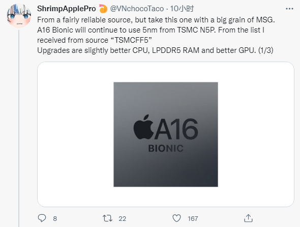 现在,一位爆料者(@ShrimpApplePro)表示,他有“相当可靠的消息来源”称苹果 A16 Bionic 将采用台积电 5nm(N5P)工艺进行生产,而不是此前业界预估的 4nm,但新的一代 A16 依然会带来更好的 CPU、GPU 和 LPDDR5 RAM。