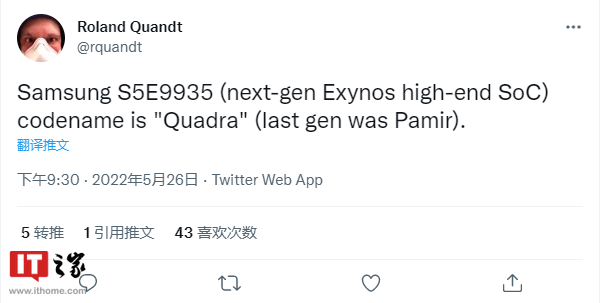 据爆料人士 Roland Quandt 称,三星已将其下一代旗舰 Exynos 芯片的内部代号设置为“Quadra”。Exynos 2200 的代号是 Pamir,今年早些时候已用于 Galaxy S22、Galaxy S22+ 和 Galaxy S22 Ultra,该新芯片可能会作为 Exynos 2300 推出。
