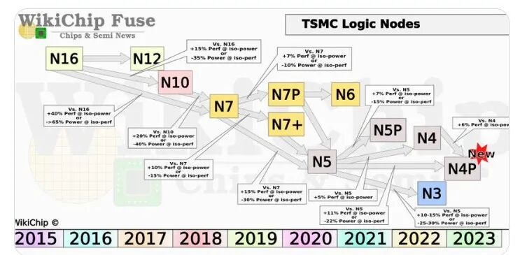 今日,天风国际分析师郭明錤在推特上放出了一张号称台积电发布时间的路线图,显示 N3 和 N4P 工艺 2023 年才开始量产,因此 iPhone 14 系列只能用 N5P 和 N4 工艺,而 N4 工艺相比 N5P 又没有明显提升,因此苹果 A16 选择 N5P 是比较合理的。