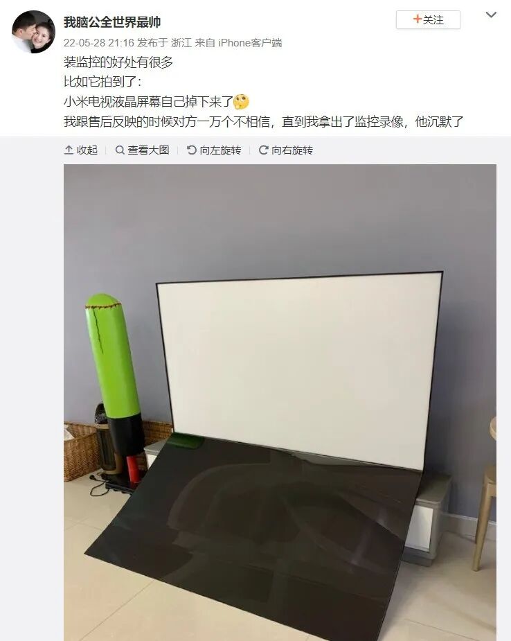 近日,微博网友 @我脑公全世界最帅 反馈,家中的小米电视液晶屏幕掉下来摔碎了,并晒出了一段监控录像。监控显示,电视屏幕为自己脱落,没有受到外力刺激。(来源:IT之家)