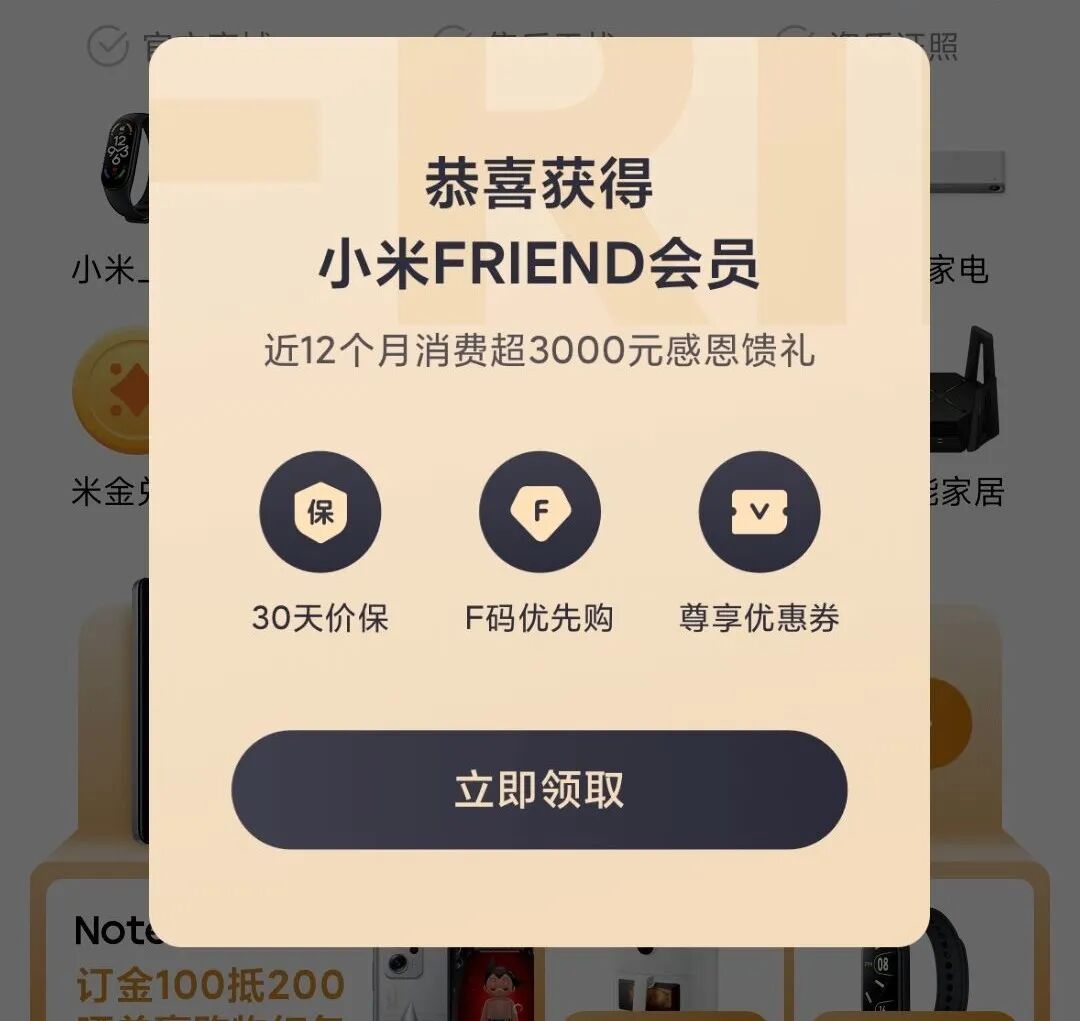 小米商城出现了小米 FRIEND 会员内测,显示近 12 个月消费超 3000 元感恩馈礼,支持 30 天价保、F 码优先购、尊享优惠券。