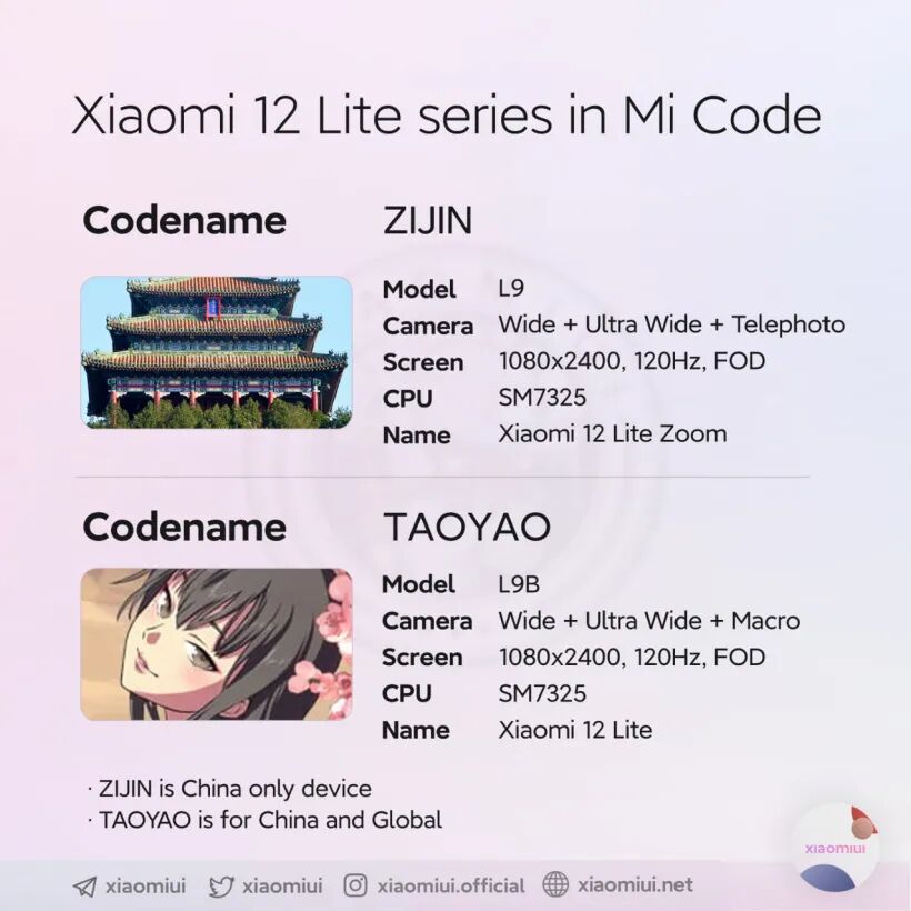小米 12 Lite 的研发代号为“taoyao”(可能是指桃夭),型号也将是 L9,该系列将搭载高通骁龙778G或780G+芯片。采用后置三摄设计,主摄是三星 ISOCELL GW3,还有广角和微距镜头,采用120Hz刷新率1080×2400分辨率的6.55" AMOLED屏。此外,它还支持屏下指纹等功能,有望采用3D弧面设计,预计仅在全球地区(海外市场)提供。