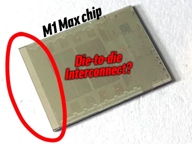 与苹果官方公布的渲染图不同,这款芯片边缘部分还有较大的一部分区域,没有在渲染图中显示。这名用户表示,仅需将这块芯片翻转,便可以与同款芯片互联,组成 MCM 多芯片封装架构,进一步提高性能。