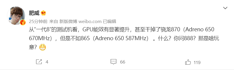 今日微博数码博主 @肥威 发布消息,称已经拿到搭载高通骁龙 8 Gen 1 芯片的测试机。从实测性能来看,GPU 的能效有显著提升,甚至比骁龙 870 Adreno 650 芯片的能效还要高。但是在能效方面不如骁龙 865。