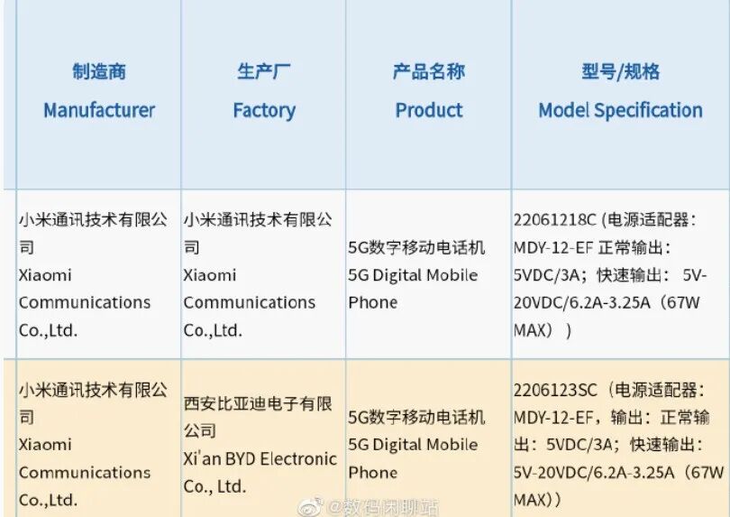 昨日,型号为 22061218C、2206123SC 的小米 5G 数字移动电话机通过 3C 认证,配备型号为 MDY-12-EF 的充电器,支持最高 67W 输出。