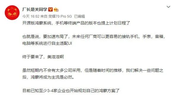 有微博博主表示,搭载开源鸿蒙 OpenHarmony 系统的手机等终端产品的版本也已经提上计划日程,相关技术已经加速布局,方便未来更多厂商更容易的接轨手机、手表、音箱、电脑等,以及进行系统 UI 自主适配。