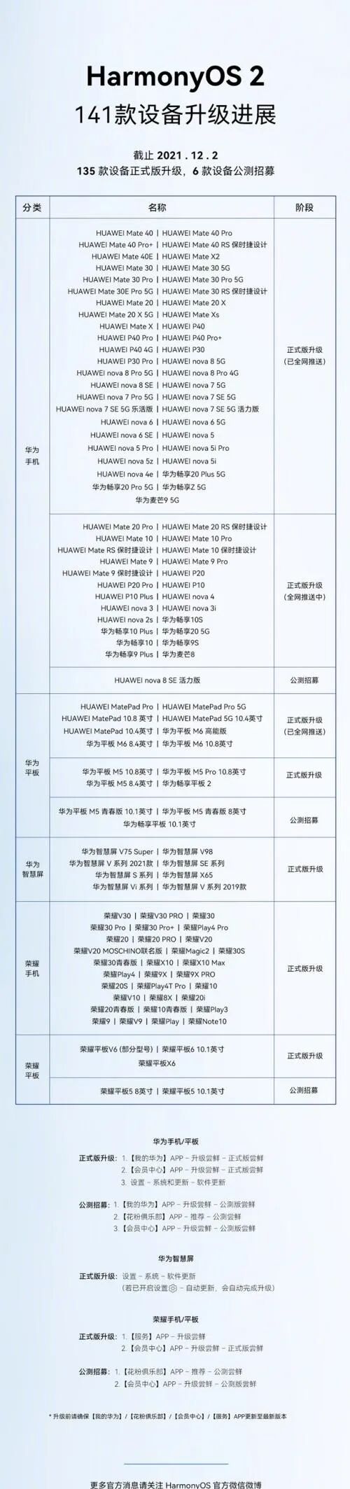近日,华为公布了鸿蒙 Harmony OS 适配进展列表,截止到 12 月 2 日,已经有 135 款设备支持升级正式版本,还有 6 款设备正在进行公测招募。