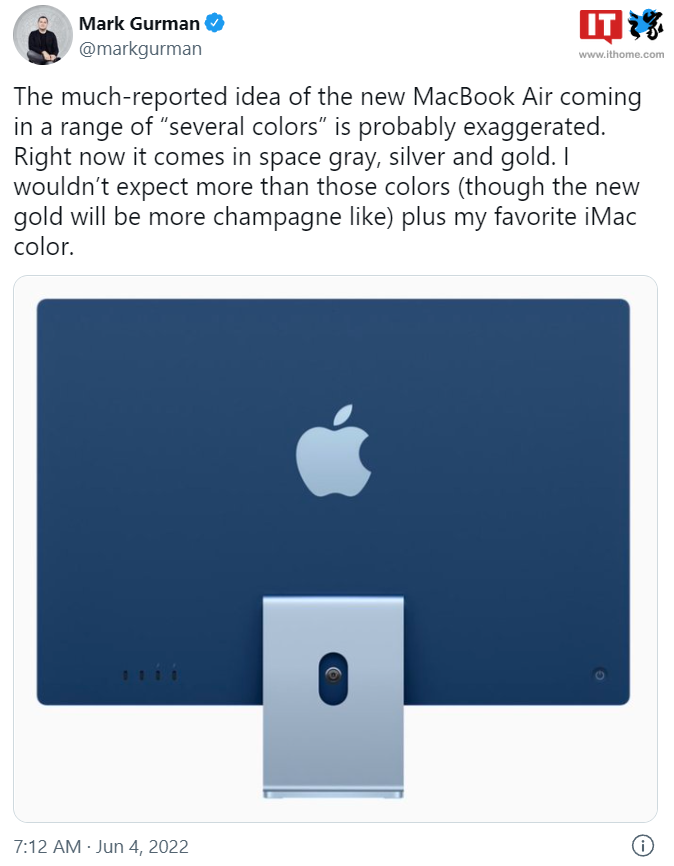据彭博社的 Mark Gurman 称,即将面世的 2022 款 MacBook Air 预计不会采用与 24 英寸 iMac 类似的颜色。