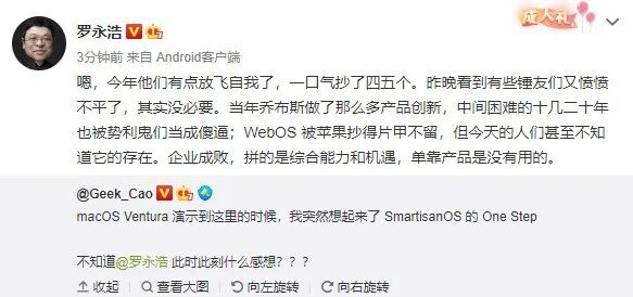 此前,苹果在 WWDC22 上正式发布 macOS Ventura。6 月 7 日下午,有网友发博,“macOS Ventura 演示到这里的时候,我突然想起来了 SmartisanOS 的 One Step。不知道@罗永浩此时此刻什么感想?”