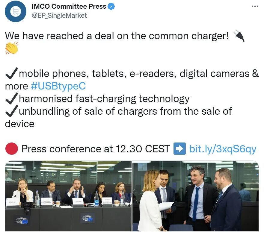 欧洲议会内部市场和消费者保护委员会通过 Twitter 公布了这一协议的具体细节,包括:手机、平板电脑、电子阅读器、数码相机和更多设备采用 USB-C 接口;统一快速充电技术;充电器销售与设备销售分开。