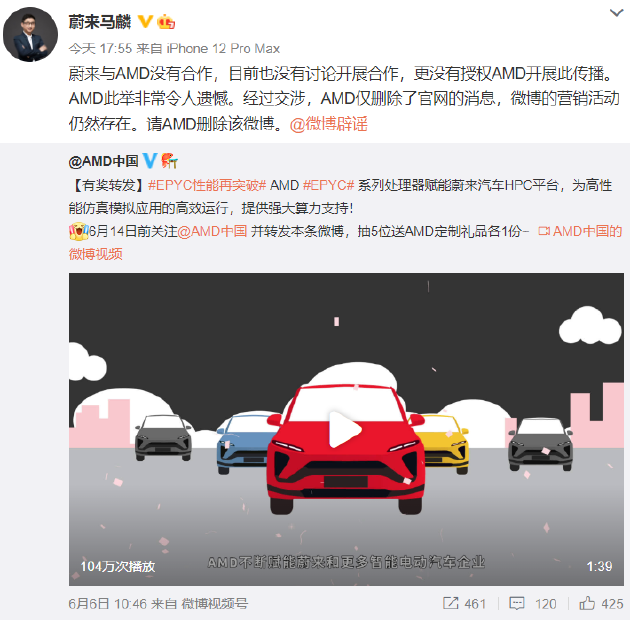 马麟转发该微博并表示:蔚来与 AMD 没有合作,目前也没有讨论开展合作,更没有授权 AMD 开展此传播。AMD 此举非常令人遗憾。经过交涉,AMD 仅删除了官网的消息,微博的营销活动仍然存在。请 AMD 删除该微博。