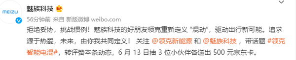 前日,领克发布了一则关于领克智能混动的微博,表示这是为年轻态人群量身定制的新潮混动。隔天,魅族科技官方账号转发了领克新能源的这一微博,并称领克为“魅族科技的好朋友”。