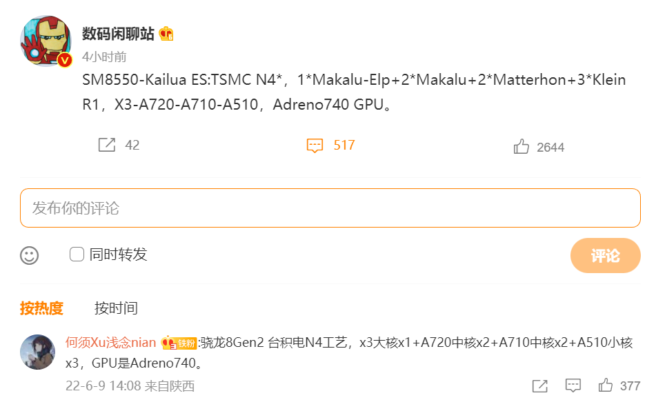 该博主透露,高通骁龙 8 Gen 2 将会继续采用台积电 4nm 工艺,CPU 为八核心设计,分别为一个 X3 大核、两个 A720 中核、两个 A710 中核以及三个 A510 小核,而 GPU 的规格为 Adreno740。