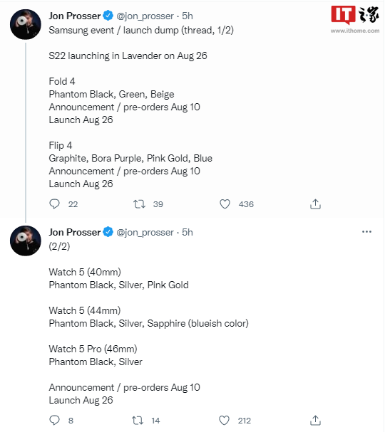 今天,海外博主 Jon Prosser 泄露了三星新品发布会的时间和产品相关信息。Jon Prosser 透露,三星将于 8 月 10 日举行新品发布会。