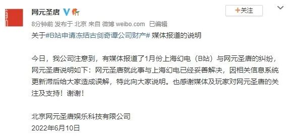 网元圣唐回应 B 站申请冻结其 3679 万元财产