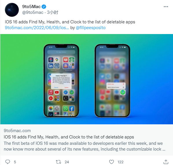 本周早些时候,iOS 16 的第一个 Beta 测试版已向开发人员提供。在此新系统中,苹果现在将允许用户通过更新卸载“查找”、“健康”和“时钟”应用程序。