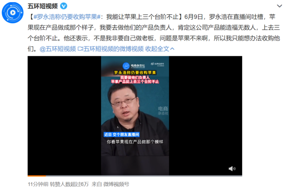 据悉,6 月 9 日,罗永浩在直播间吐槽,苹果现在产品做成那个样子,我要去做他们的产品负责人,肯定这公司产品能造福无数人,上去三个台阶不止。他还表示,不是我非要自己做老板,问题是苹果不来啊,所以我只能想办法收购他们。