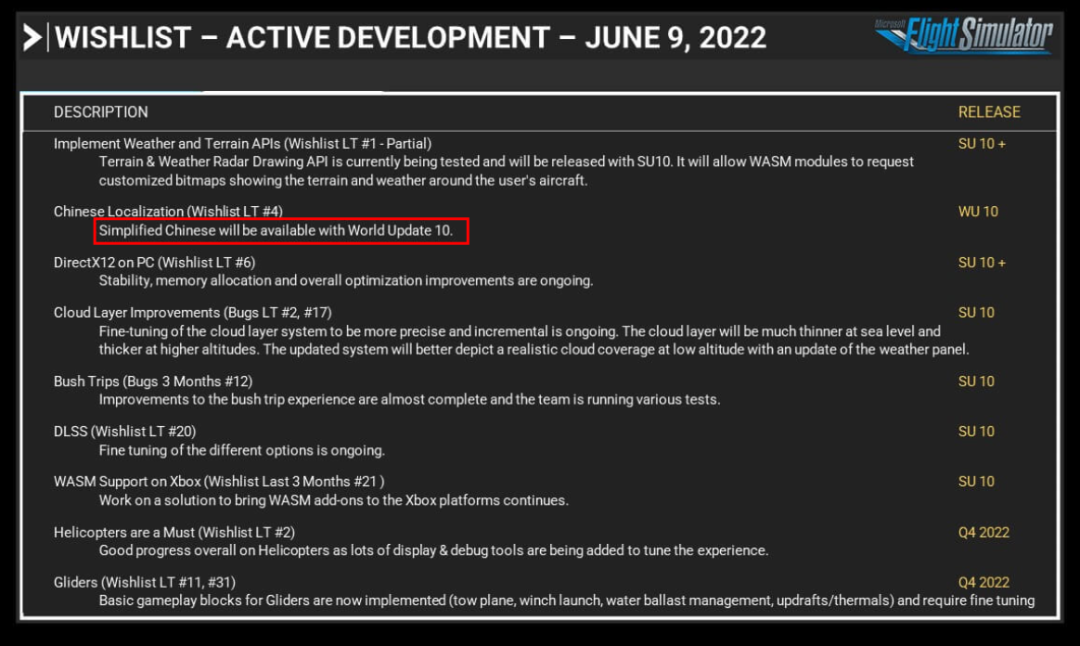 《微软飞行模拟》官网更新日志显示,游戏将于“世界更新 10”中上线简体中文。此外,DirectX 12(PC)、DLSS 等功能也在计划中。