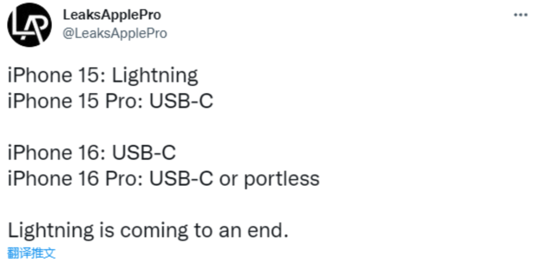 近期,爆料人士 @LeaksApplePro 称,苹果将在 iPhone 15 系列上尝试采用 USB-C 端口,其中 iPhone 15 Pro 换用 USB-C 端口,iPhone 15 继续采用 Lightning 接口;而 iPhone 16 换用 USB-C 端口,iPhone 16 Pro 换用 USB-C 端口或者无端口,Lightning 接口面临终结。