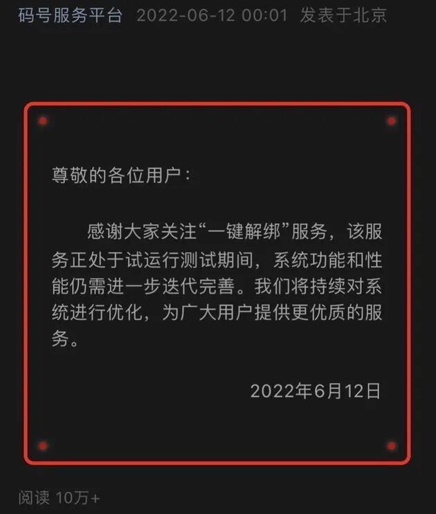 此前多家媒体报道“一号通查”微信公众号(已更名为“码号服务平台”)推出了手机号码“一键解绑”功能,但很多网友表示不能使用。