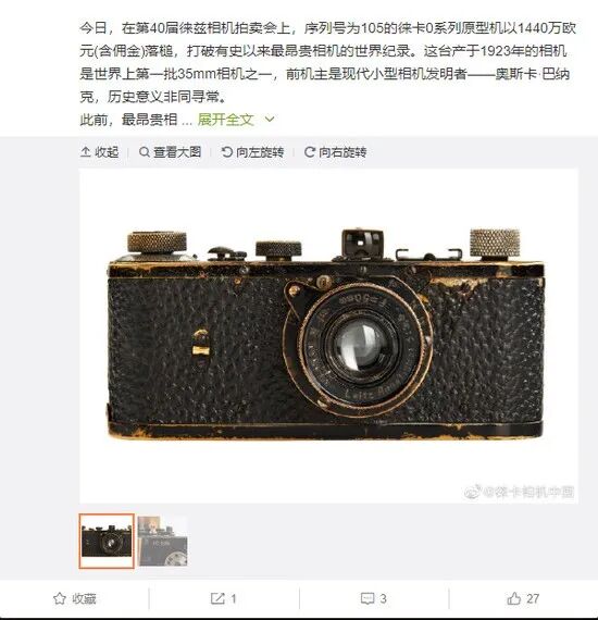 @徕卡相机中国官微消息,在6月11日举行的第40届徕兹相机拍卖会上,序列号为105的徕卡0系列原型机以1440万欧元(含佣金,约合1.01亿人民币)落槌,打破有史以来最昂贵相机的世界纪录。