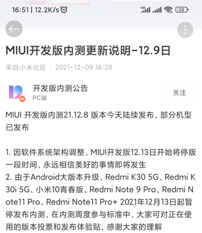 此外,由于 Android 大版本升级,Redmi K30 5G、Redmi K30i 5G、小米 10 青春版、Redmi Note 9 Pro、Redmi Note 11 Pro、Redmi Note 11 Pro+ 2021 年 12 月 13 日起暂停发布内测。(来源:IT之家)