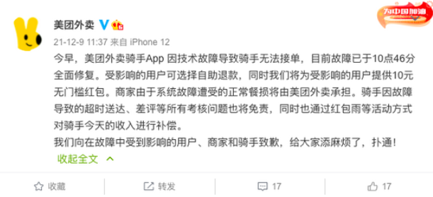 今天上午,美团外卖在官方微博发文称,今早,美团外卖骑手 App 因技术故障导致骑手无法接单,目前故障已于 10 点 46 分全面修复。同时,美团外卖向在故障中受到影响的用户、商家和骑手致歉。