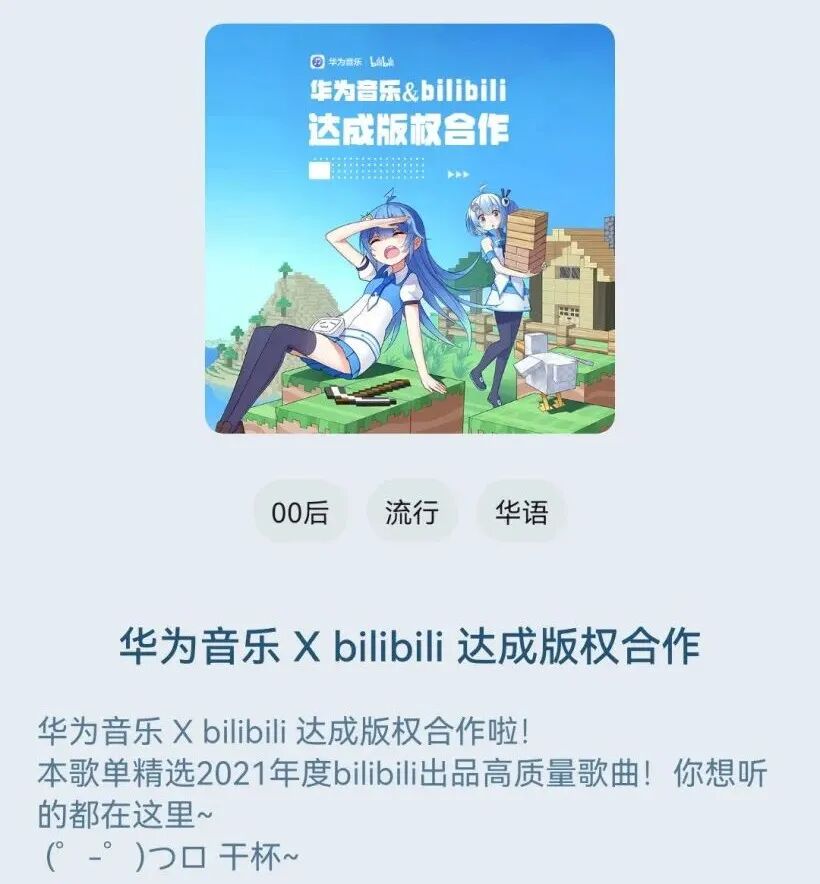 据报道,华为音乐现已与 bilibili 达成版权合作,提供包括 2021 年度音乐歌单等资源。