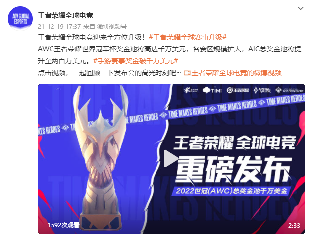 据王者荣耀全球电竞官方微博,王者荣耀全球电竞迎来全方位升级,AWC 王者荣耀世界冠军杯奖金池将高达千万美元。