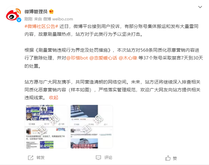 根据《刷量营销违规行为界定及处罚措施》,本次站方对 568 条同质化恶意营销内容进行了删除处理,并对 @珍惜 bot @恋爱暖心话 @木心缘 等 37 个账号采取禁言 7 天到 30 天的处置。