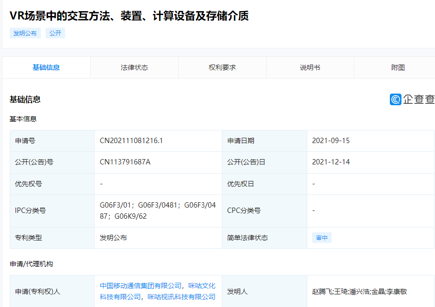 企查查专利摘要显示,本发明公开了一种 VR 场景中的交互方法、装置、计算设备及存储介质。