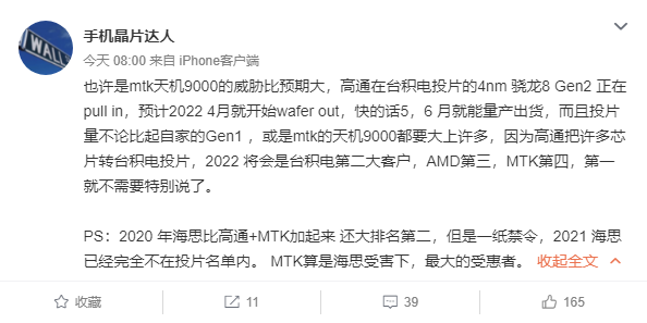 据称,高通已经把大量芯片代工订单从三星转向台积电投片,预计将成为台积电 2022 第二大客户(苹果第一,AMD 第三,MTK 第四)。(来源:IT之家)