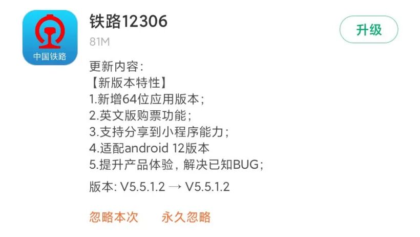 小米应用商店中的铁路 12306 App 再次迎来 v 5.5.1.2 更新,本次更新新增支持 64 位应用版本,支持英文版购票功能,已适配安卓 12 版本。