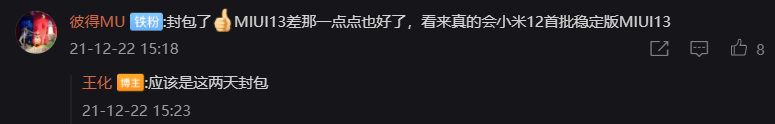 在评论区中,王化表示自己已经用上了 MIUI 13,系统应该会在这两天封包。(来源:IT之家)