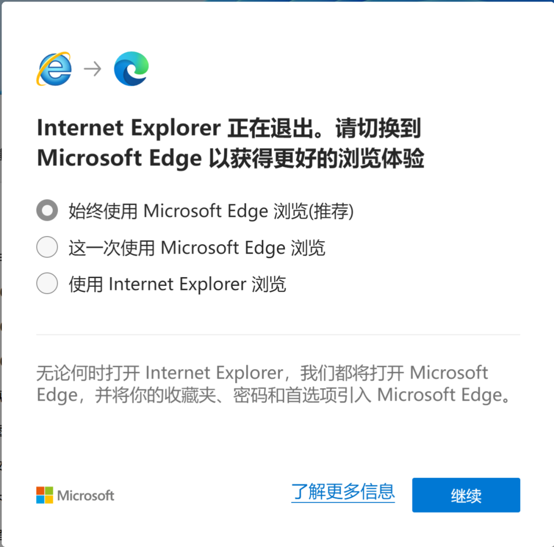 据网友反馈,现在在 Windows 10 等系统上访问 IE 浏览器会出现相关弹窗提醒:Internet Explorer 正在退出。请切换到 Microsoft Edge 以获得更好的浏览体验。(来源:新浪科技)