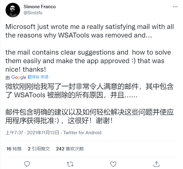 经过一些争议后,微软似乎已经努力与 WSATools 开发者 @Franco 解决了这个问题。外媒发现目前该应用已经重新上架了 Windows 官方的微软商店。此外,据开发者所说,微软之前还特意写了一封邮件向他道歉,并说明了下架的原因。(来源:IT之家)
