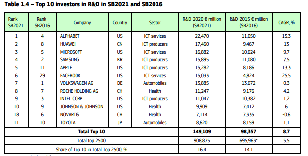 日前,欧盟 2021 工业研发记分榜(ScoreBoad 2021)公布,华为 2020 年研发投入排名第二,是前十名里唯一的中国公司,力压苹果、英特尔和微软等巨头,仅次于谷歌母公司 Alphabet。