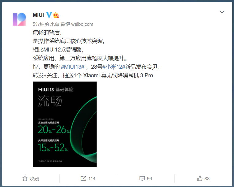 随后在11点半,MIUI官方微博再次表示:“流畅的背后,是操作系统底层核心技术突破。相比MIUI12.5增强版,系统应用、第三方应用流畅度大幅提升。快,更稳的 #MIUI13# ,28号#小米12#新品发布会见。”