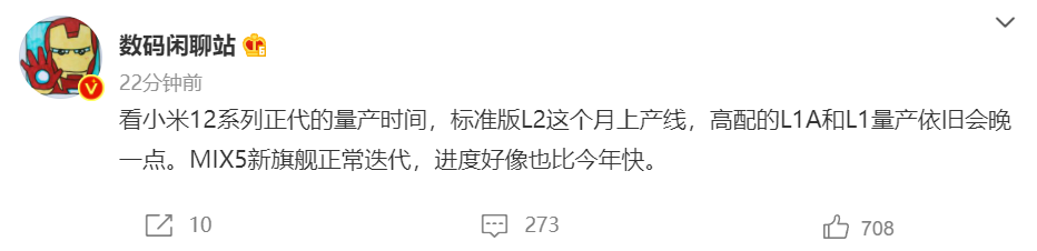 数码博主 @数码闲聊站 此前爆料称,从小米 12 系列正代量产时间来看,标准版 L2 本月上产线,高配版 L1A 与 L1 量产依旧会晚一些。MIX5 新旗舰则会正常迭代。(来源:IT之家)