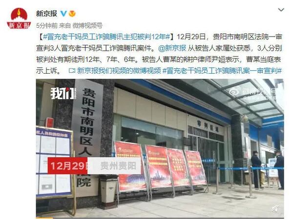 12 月 29 日,贵阳市南明区法院一审宣判 3 人冒充老干妈员工诈骗腾讯案件。