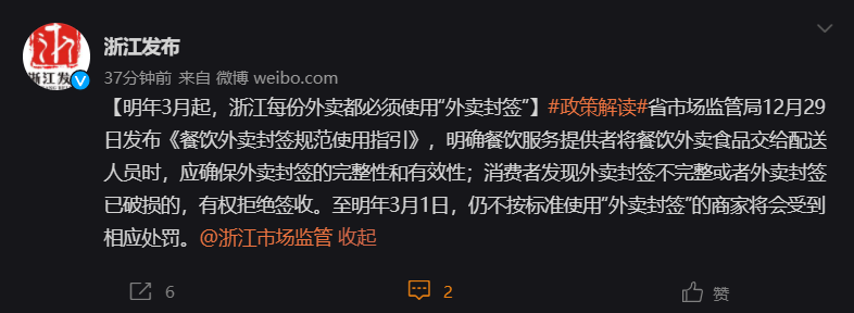 根据12 月 29 日浙江发布的《餐饮外卖封签规范使用指引》,餐饮服务提供者将餐饮外卖食品交给配送人员时,应确保外卖封签的完整性和有效性。